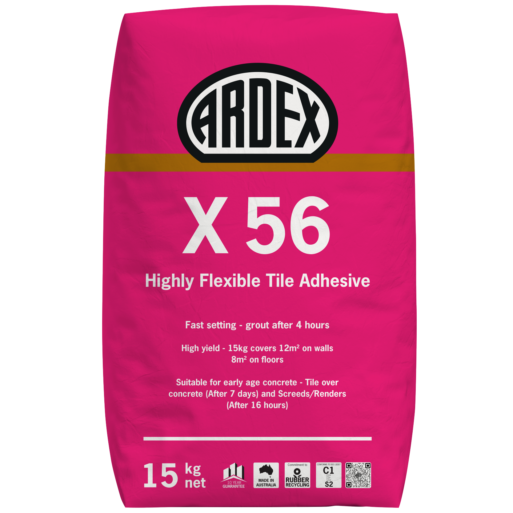 A highly flexible tile adhesive that is also fast setting. This makes ARDEX X 56 suitable for tiling directly to timber and over heated slabs.